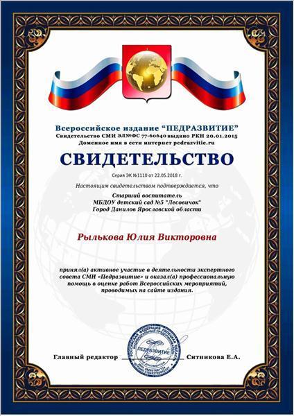 | Свидетельство об активном участии в деятельности экспертного совета СМИ "Педразвитие". 22.05.2018 г. |