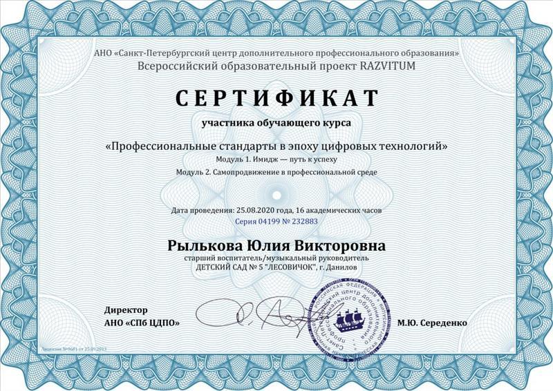| Сертификат участника обучающего курса "Профессиональные стандарты в эпоху цифровых технологий" (16 часов) август 2020 г. Всероссийский образовательный проект RAZVITUM |