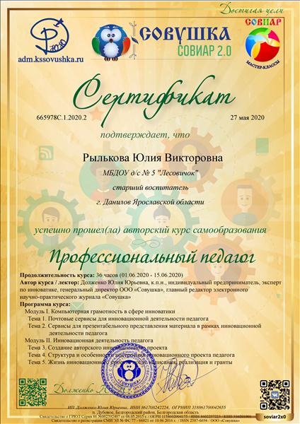 | Сертификат об успешном прохождении авторского курса самообразования "Профессиональный педагог" 27 мая 2020 г. СОВИАР |