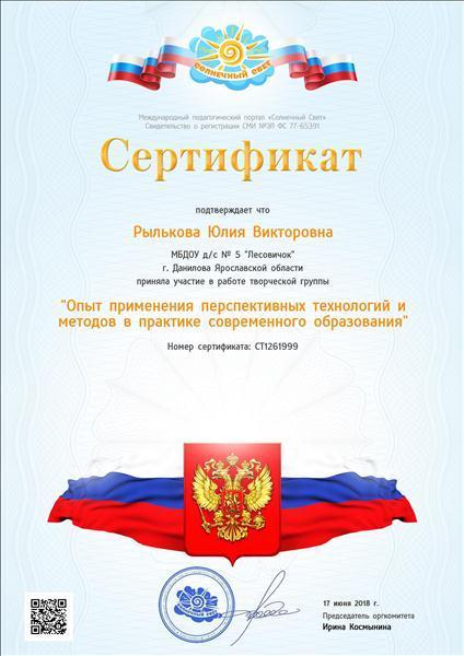 | Сертификат участника творческой группы "Опыт применения перспективных технологий и методов в практике современного образования" июнь 2018 г. |