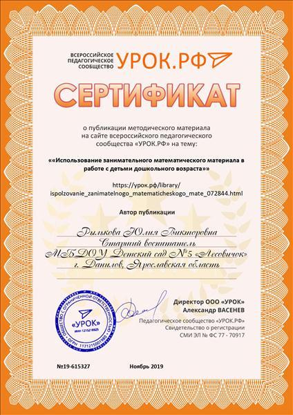 | Сертификат о публикации методического материала на сайте всероссийского педагогического сообщества "УРОК. РФ" "Использование занимательного математического материала в работе с детьми дошкольного возраста" Ноябрь 2019 г. |