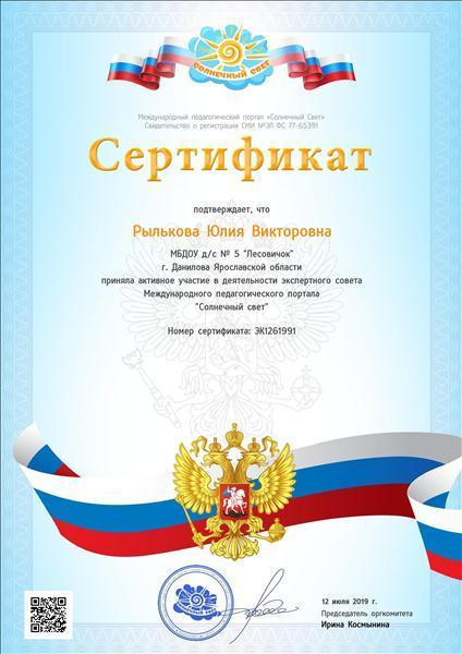 | Сертификат участника экспертного совета Международного педагогического портала "Солнечный свет" июль 2019 г. |