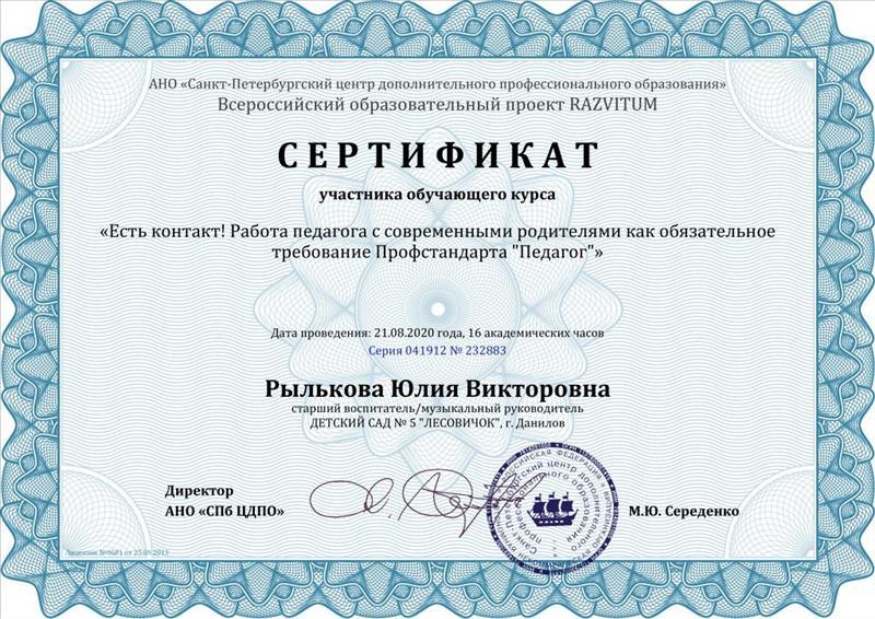 | Сертификат участника обучающего курса "Есть контакт! Работа педагога с современными родителями как обязательное требование Профстандарта "Педагог" (16 часов) август 2020 г. Всероссийский образовательный проект RAZVITUM