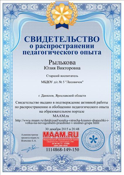 | Свидетельство о распространении педагогического опыта на образовательном портале MAAM.ru 30.12.2015 г. |