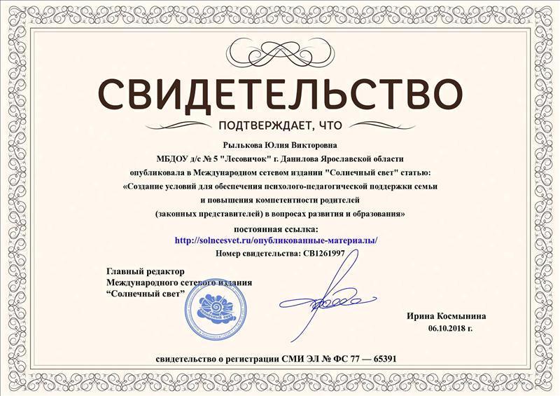 | Свидетельство о публикации в Международном сетевом издании "Солнечный свет" октябрь 2018 г. |