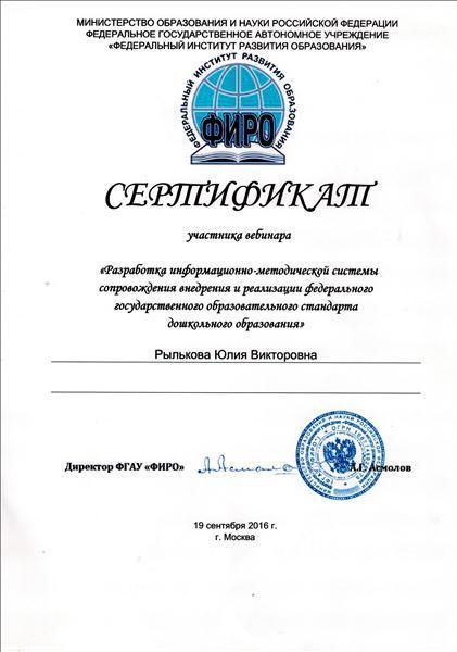 | Участник вебинара "Разработка информационн-методической системы сопровождения внедрения и реализации федерального государственного образовательного стандарта дошкольного образования" 19.09.2016 г. |