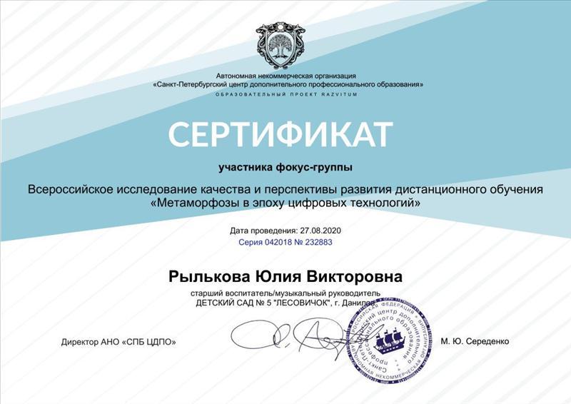 | Сертификат участника фокус-группы. Всероссийское исследование качества и перспективы развития дистанционного обучения "Метаморфозы в эпоху цифровых технологий" 27.08.2020 г. Всероссийский образовательный проект RAZVITUM |