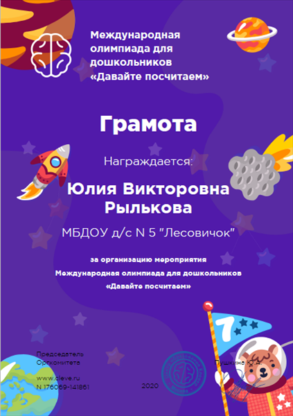| Грамота за организацию олимпиады для дошкольников "Давайте посчитаем" | "Клевер" Международные дистанционные олимпиады и конкурсы" | 21.01.2020 | Файл (JPG; 189Кб) |